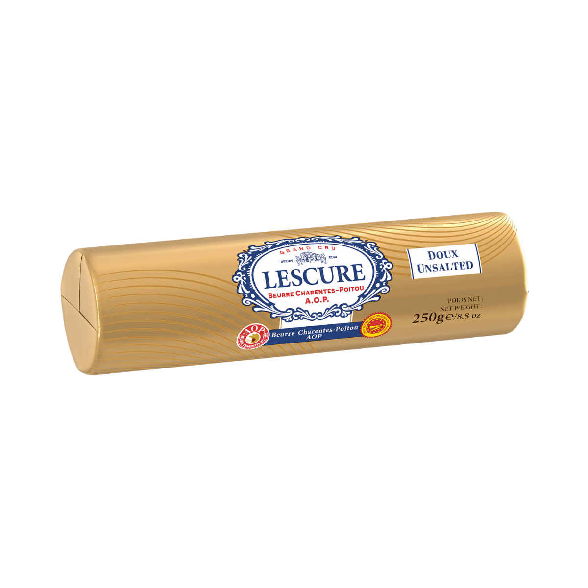 Le beurre doux Lescure AOP Charentes-Poitou en format rouleau est particulièrement adapté à la dégustation, à la cuisine et à la pâtisserie.