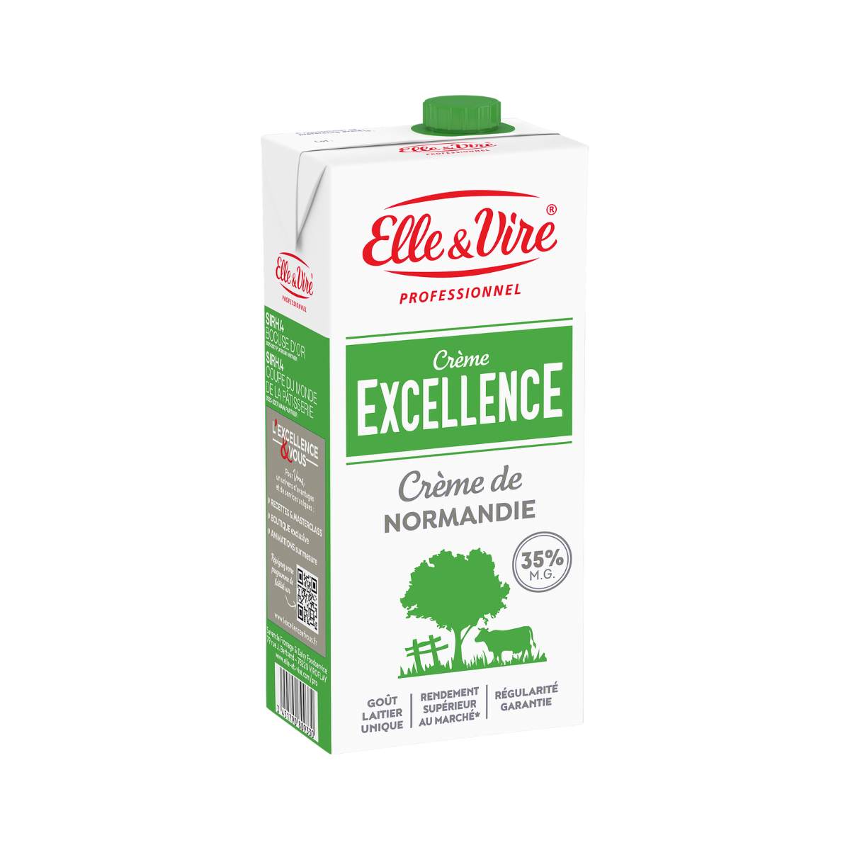 Si la Crème Excellence s’est imposée auprès des chefs, c’est grâce à sa stabilité parfaite, son taux de foisonnement exceptionnel (2,8 L en moyenne), son authenticité. Des qualités qu’elle doit au savoir-faire crémier Elle & Vire, à sa Normandie natale, mais aussi à la passion de tous ceux qui la font exister, des producteurs de lait aux chefs et pâtissiers, qui chaque jour la subliment.