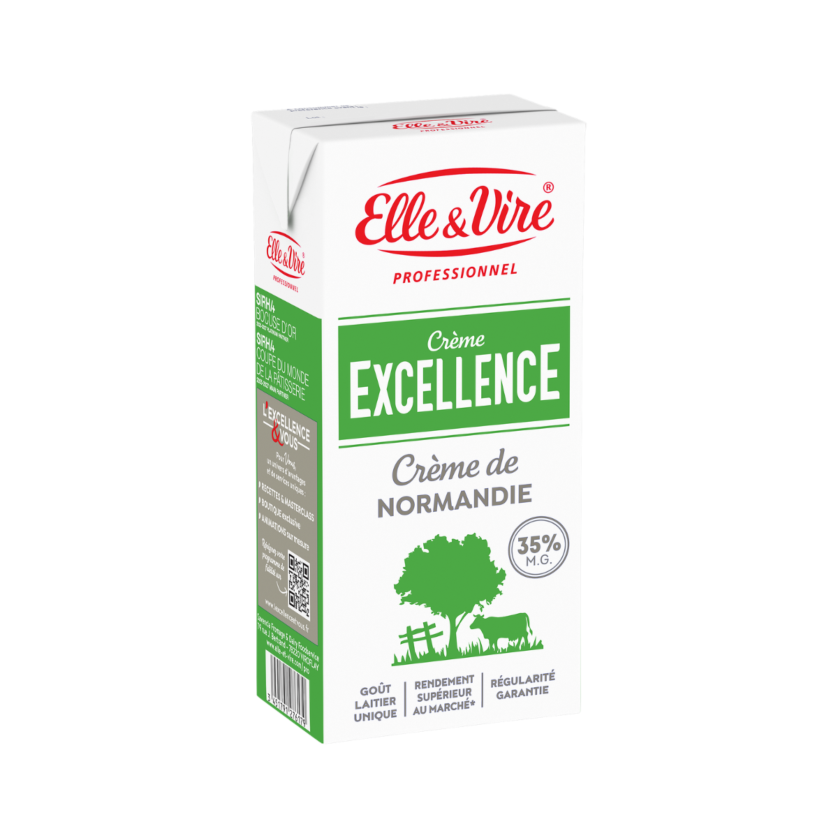 Si la Crème Excellence s’est imposée auprès des chefs, c’est grâce à sa stabilité parfaite, son taux de foisonnement exceptionnel (2,8 L en moyenne), son authenticité. Des qualités qu’elle doit au savoir-faire crémier Elle & Vire, à sa Normandie natale, mais aussi à la passion de tous ceux qui la font exister, des producteurs de lait aux chefs et pâtissiers, qui chaque jour la subliment.