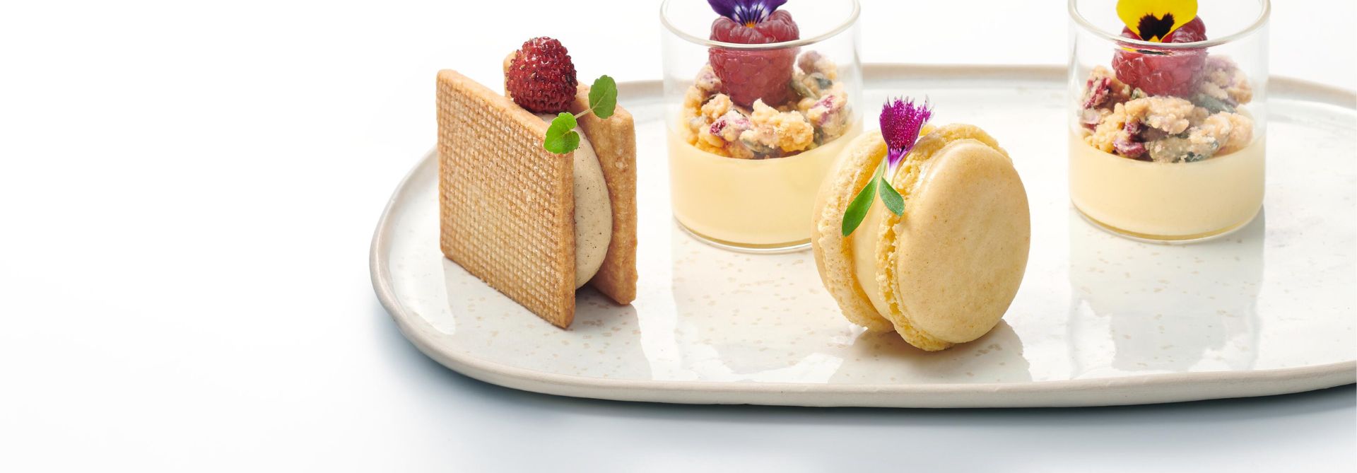 Bien lisser le crémeux, le verser dans une poche à douille unie, assembler les macarons et décorer avec un pétale d’oeillet de Chine et quelques pousses de Lemon cress.