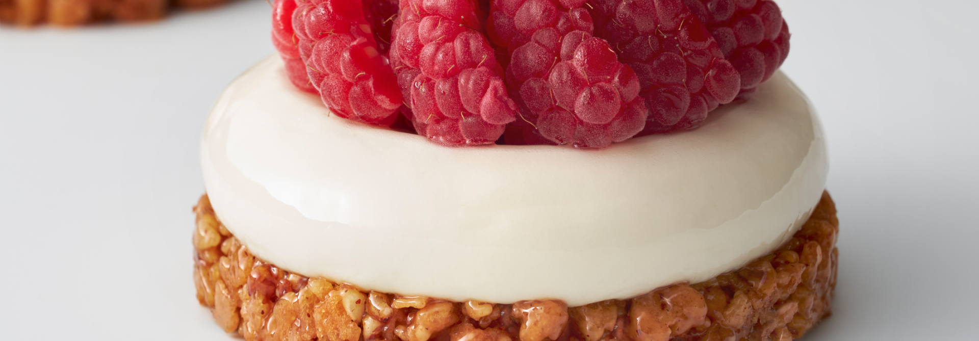 Tasser 25 g de croustillant reconstitué sarrasin dans des cercles à tartelette de 7,5 cm de diamètre. Mettre au congélateur. Monter la Sublime infusée aux feuilles de romarin et pocher une boule de la taille de la base sur le fond (environ 30 g). Appuyer avec une louche de 10 cm de diamètre légèrement chauffée pour créer une cavité. Mettre au réfrigérateur puis pulvériser une fine couche de nappage neutre. Pocher 10 g de compotée de framboise au centre et déposer des framboises coupées en deux pour former une couronne et finir par quelques framboises au centre. Décorer avec des pousses de vene cress.
